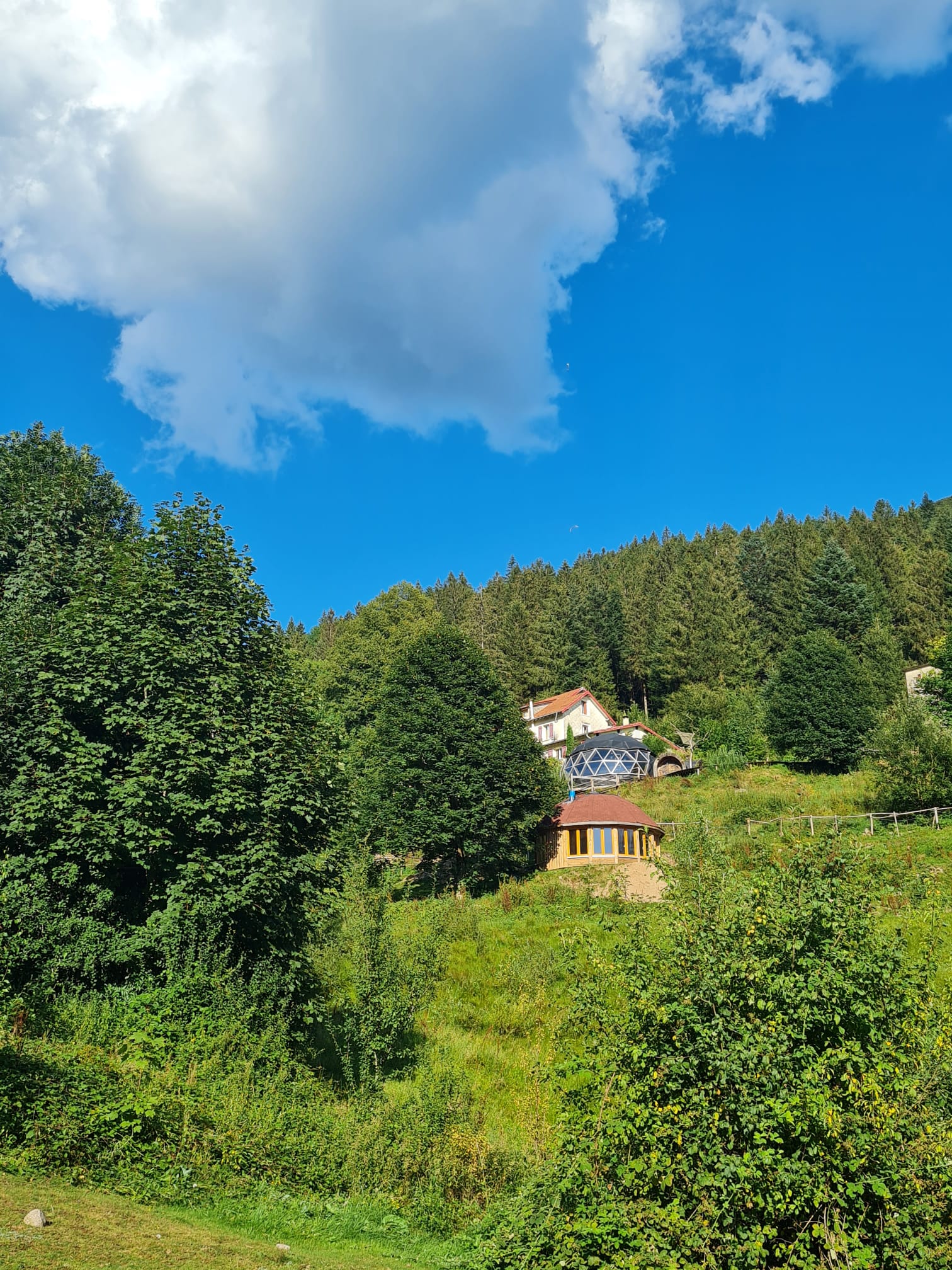Zwischen Colmar und Belfort, liegt Bussang, ein Dorf in den Vogesen. In wunderschöner naturvoller Alleinlage liegt unser Seminarhaus mit angeschlossenem kleinen Naturcamping und kleinen Hütten und den Häusern der Gemeinschaft auf einem grossen Gelände, von der Sonne verwöhnt, mit dem klaren Wasser der Mosel, die ein bisschen weiter oben ihren Urspung in der Quelle hat. Unterhalb grasen Pferde, oberhalb, eine gute Wanderung oder eine kleine kurze Autofahrt bergauf, liegt LE COL DE BUSSANG ein fantastischer Aussichtspunkt mit Rundumblick in die weite Ferne.